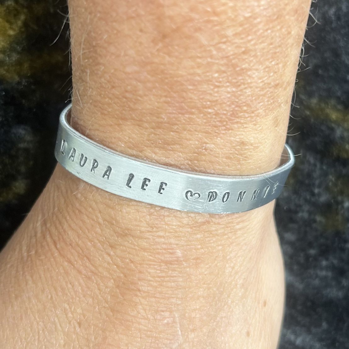 Stamped aluminum cuff bracelets now available! Customize with names/dates/ or phrase of your choice.